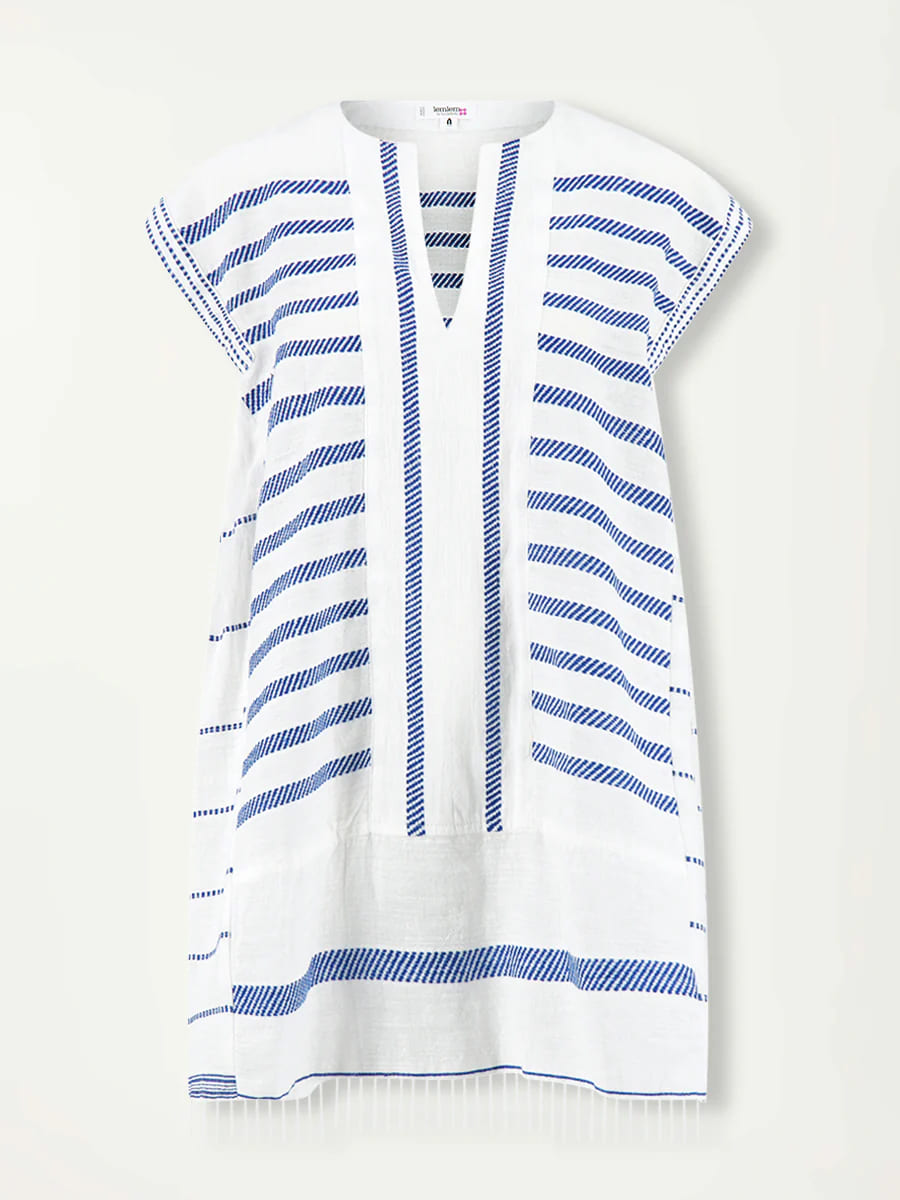 Die Tiki Azure-Kollektion zeichnet sich durch einen strahlend weißen Stoff aus, der mit diagonalen, gepunkteten Streifen in leuchtendem Blau und einer zarten Struktur gewebt ist, was für einen lässigen und mühelosen Look sorgt.