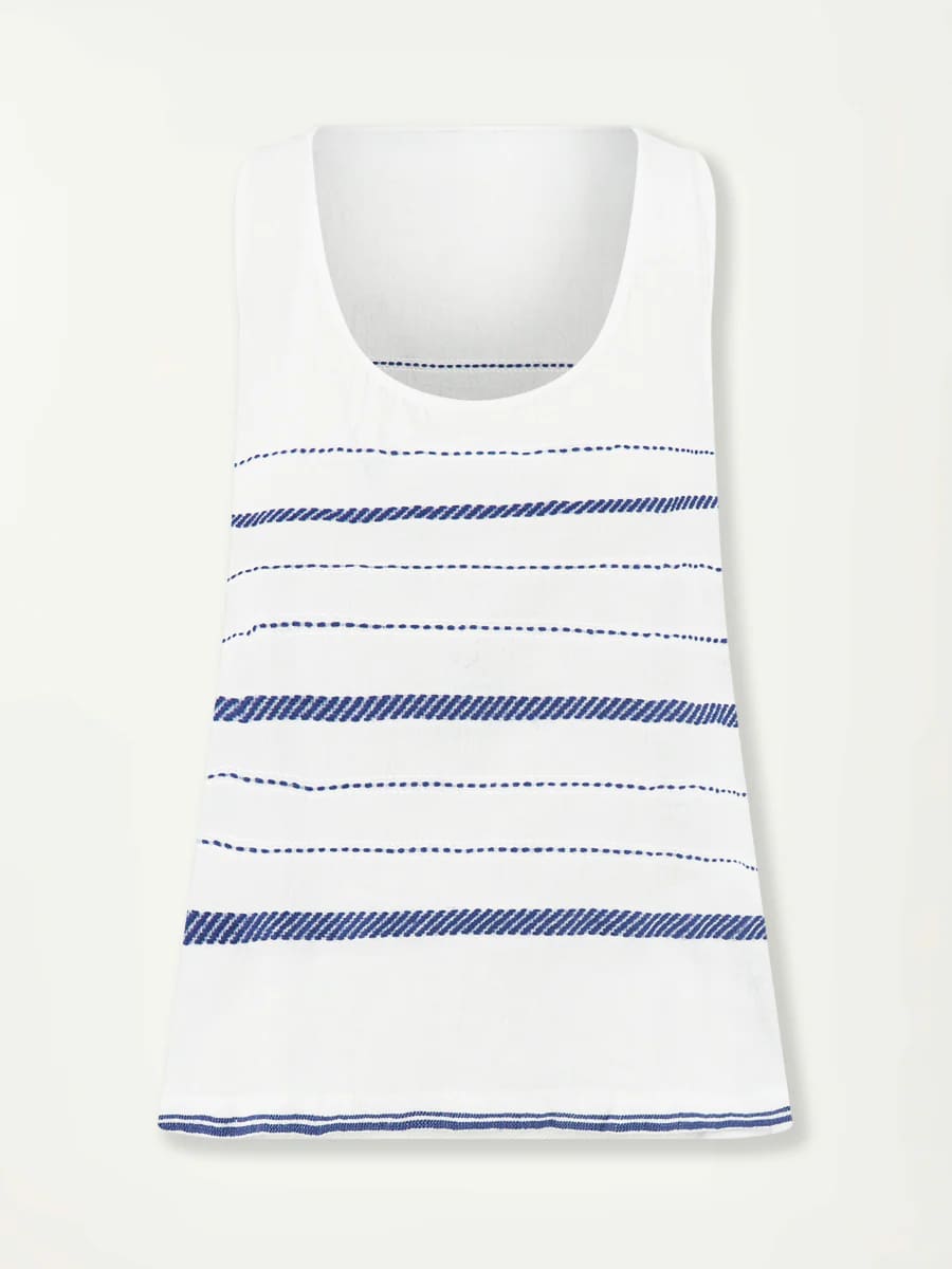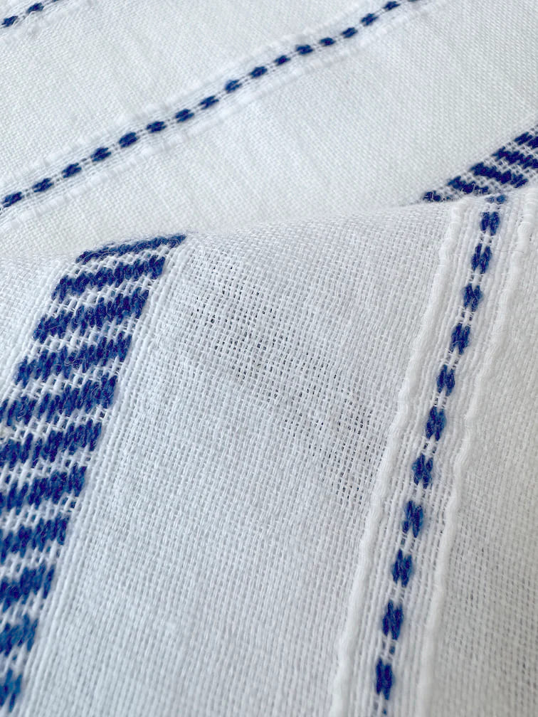 Die Tiki Azure-Kollektion zeichnet sich durch einen strahlend weißen Stoff aus, der mit diagonalen, gepunkteten Streifen in leuchtendem Blau und einer zarten Struktur gewebt ist, wodurch ein lässiger und müheloser Look entsteht.