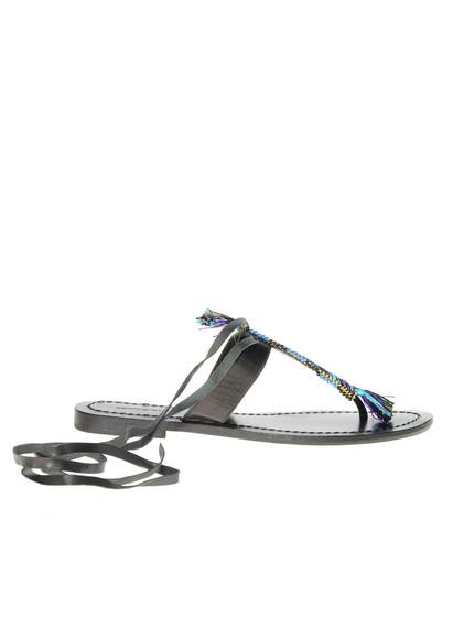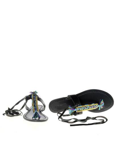 Diese schwarze Ledersandale von Antik Batik ist mit den geflochtenen Verzierungen und den Stickereien unverzichtbar und ein richtiger Hingucker für die Sommersaison. Die langen Lederriemen werden am Knöchel gebunden. Die Sandale ist sehr vielseitig kombinierbar und passt sowohl zu kurzen Shorts als auch zu Maxikleidern.