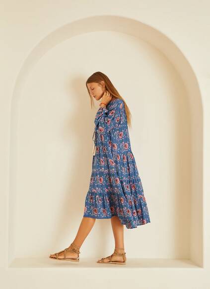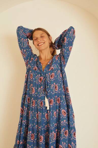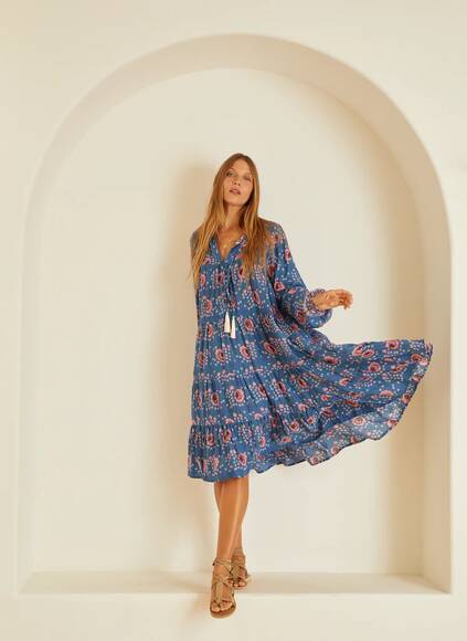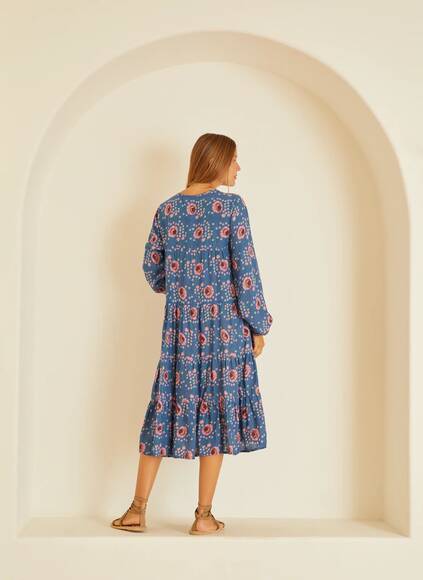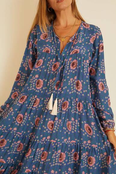 Gestuftes Kleid mit vollen Ärmeln und elastischen Manschetten.