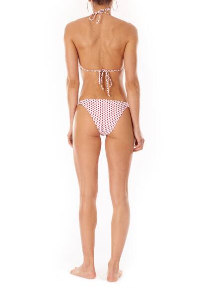 Das Amara Knot Bandeau ist weiß und hat einen Print mit kleinen roten Quadraten. Binden Sie den Bikini entweder als Neckholder um Ihren Hals oder um den Rücken.