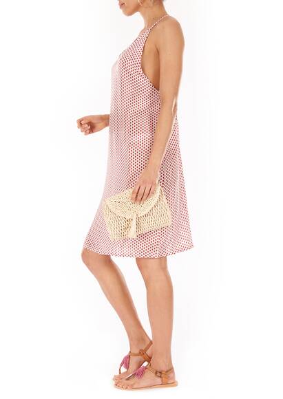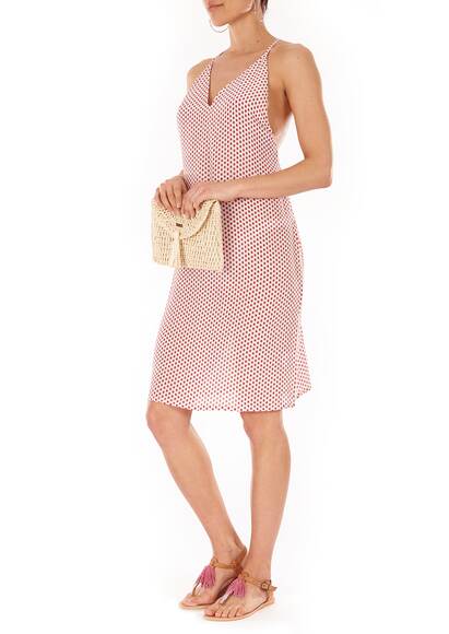 Das Mini Kleid des Labels Evarae ist aus leichter Seide und ist mit Spaghetti Trägern in heißen Sommermonaten luftig zu tragen.