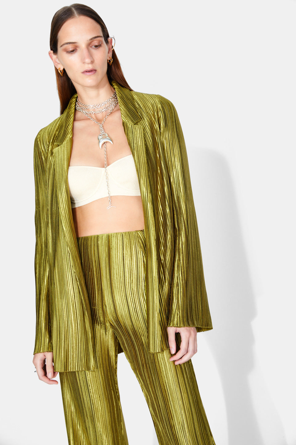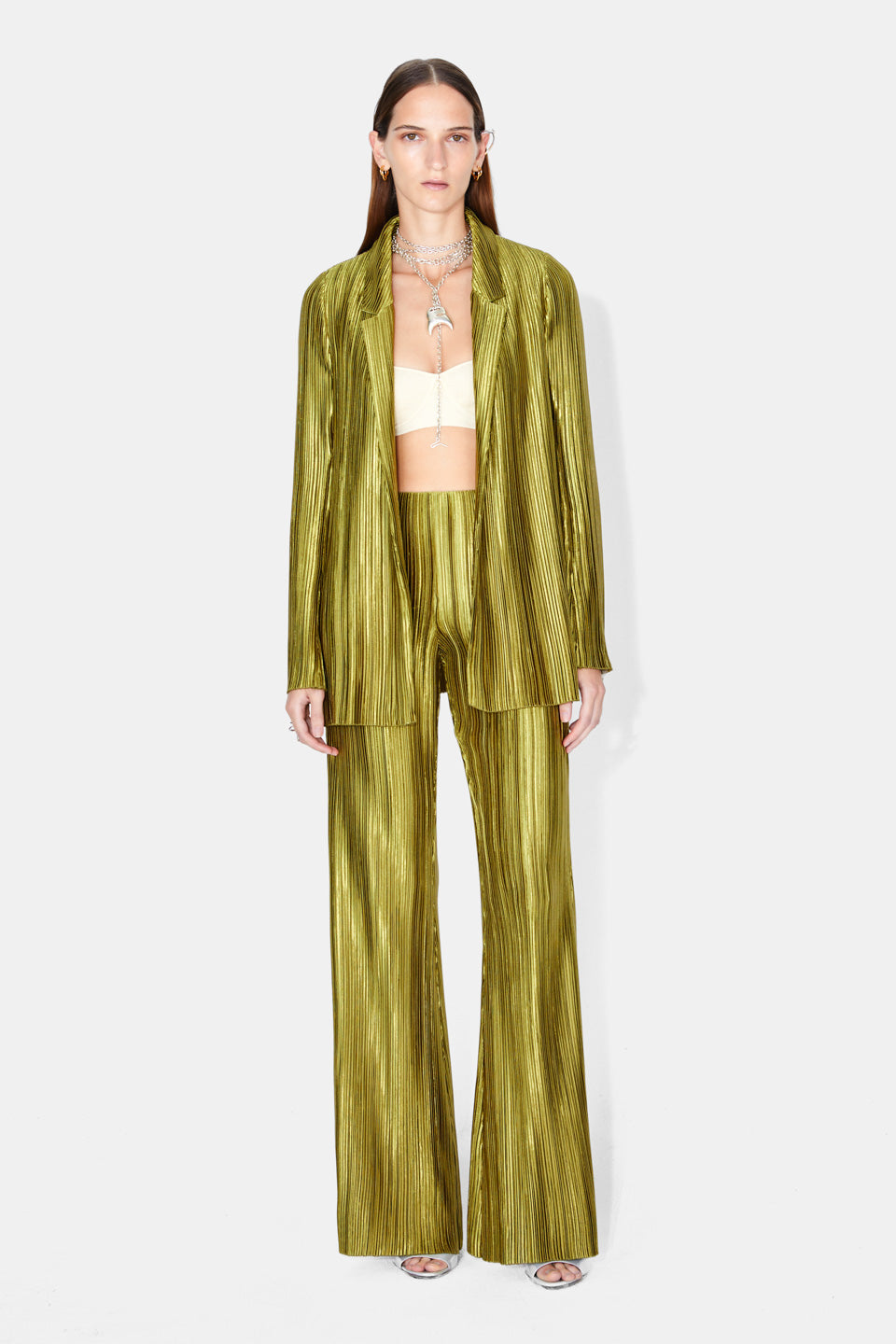 Die Nuage Hose von Galvan besticht durch ihren fließend glänzenden, plissierten Stoff und eine elegante, zugleich lässige Silhouette. Der hohe Bund und das ausgestellte Bein sorgen für einen modernen Look, während die feinen Falten dem Design Leichtigkeit und Bewegung verleihen. Die offene Schnittkante am Saum unterstreicht die hochwertige Verarbeitung. Perfekt kombiniert mit dem passenden Blazer von Galvan wird diese Hose zum stilvollen Ensemble für glamouröse Abende, besondere Events oder festliche Anlässe.