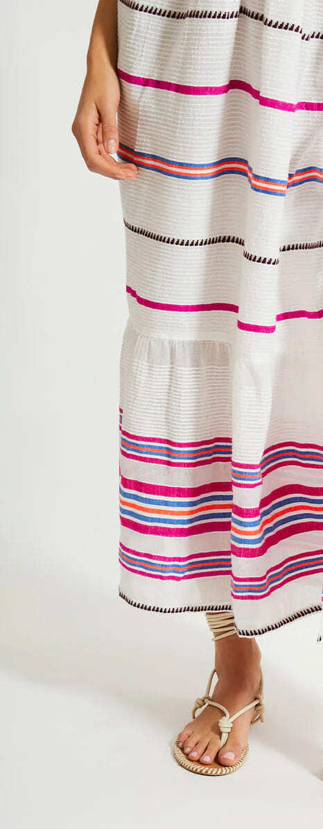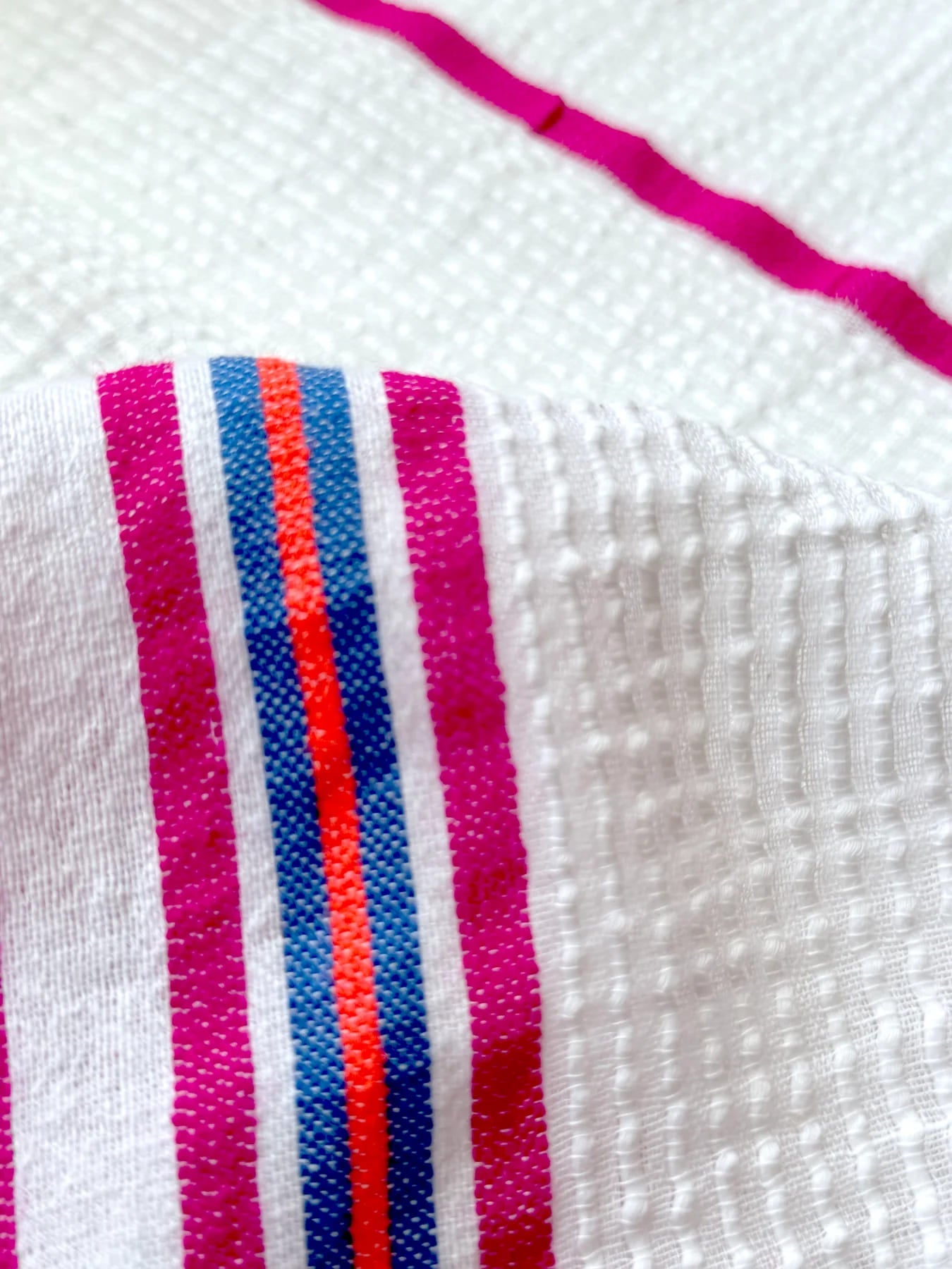 Die Zelele Orchid Collection zeichnet sich durch ein Streifenmuster in leuchtendem Magenta und Blau auf einem strahlend weißen Hintergrund aus. Der Stoff verfügt über eine strukturierte Webart, bei der dickeres Garn durch feinere Gaze gewebt ist, wodurch ein einzigartiger bienenstockähnlicher Effekt entsteht.