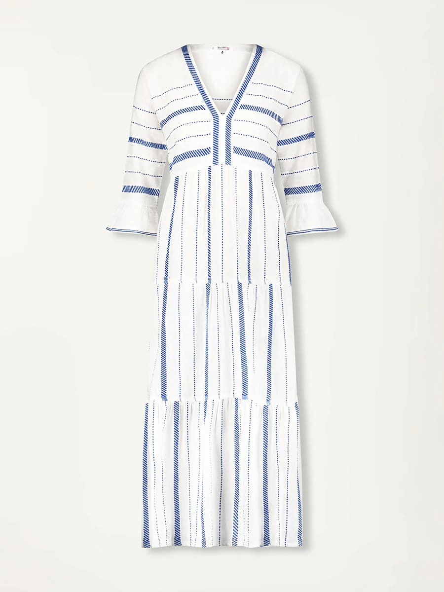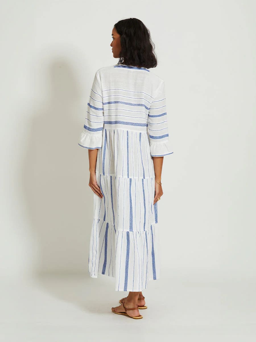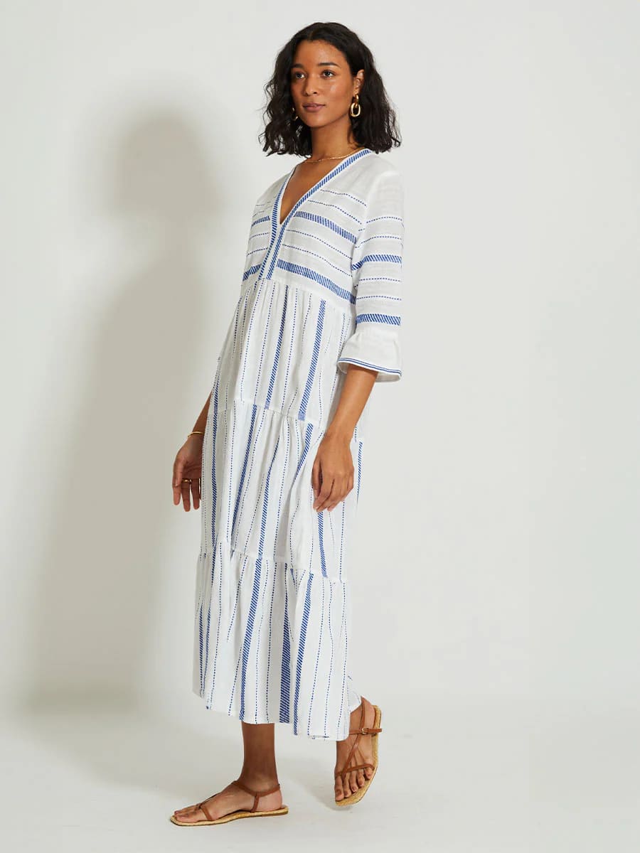 Dieses lange, flatternde Kleid verfügt über ¾-Glockenärmel, einen tiefen Ausschnitt und einen luftigen, gestuften Rüschenbesatz am Saum. Die Empire-Taille sorgt für eine schmeichelhafte Silhouette für jeden Tag.