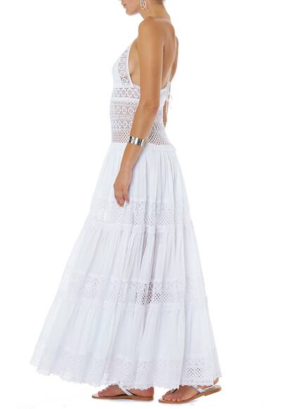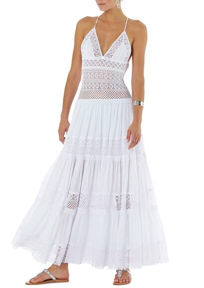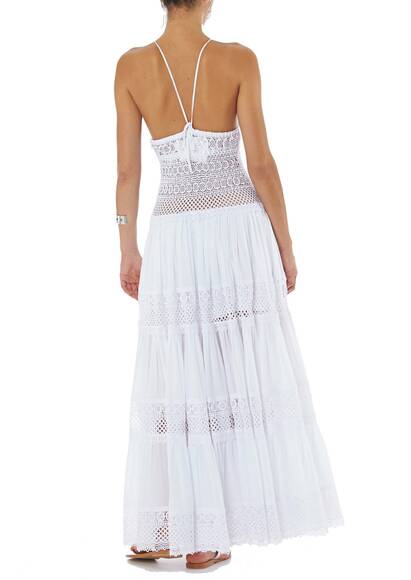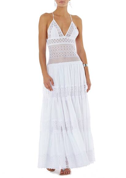 Das Kleid Miriam von Charo Ruiz ist aus feinster Häkelspitze gemacht. Spaghetti Träger, die am Rücken zusammenlaufen und der tiefe Ausschnitt hinten sind Details, die das Kleid abendtauglich und verführerisch machen. Tragen Sie es mit Sandalen von Mystique.