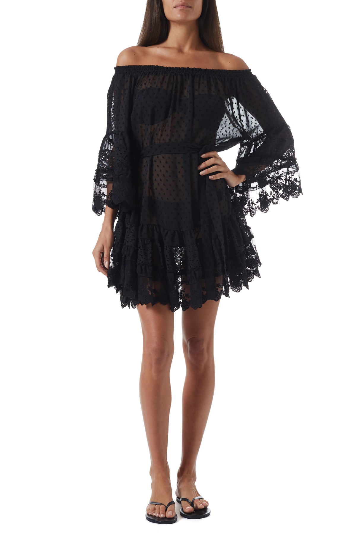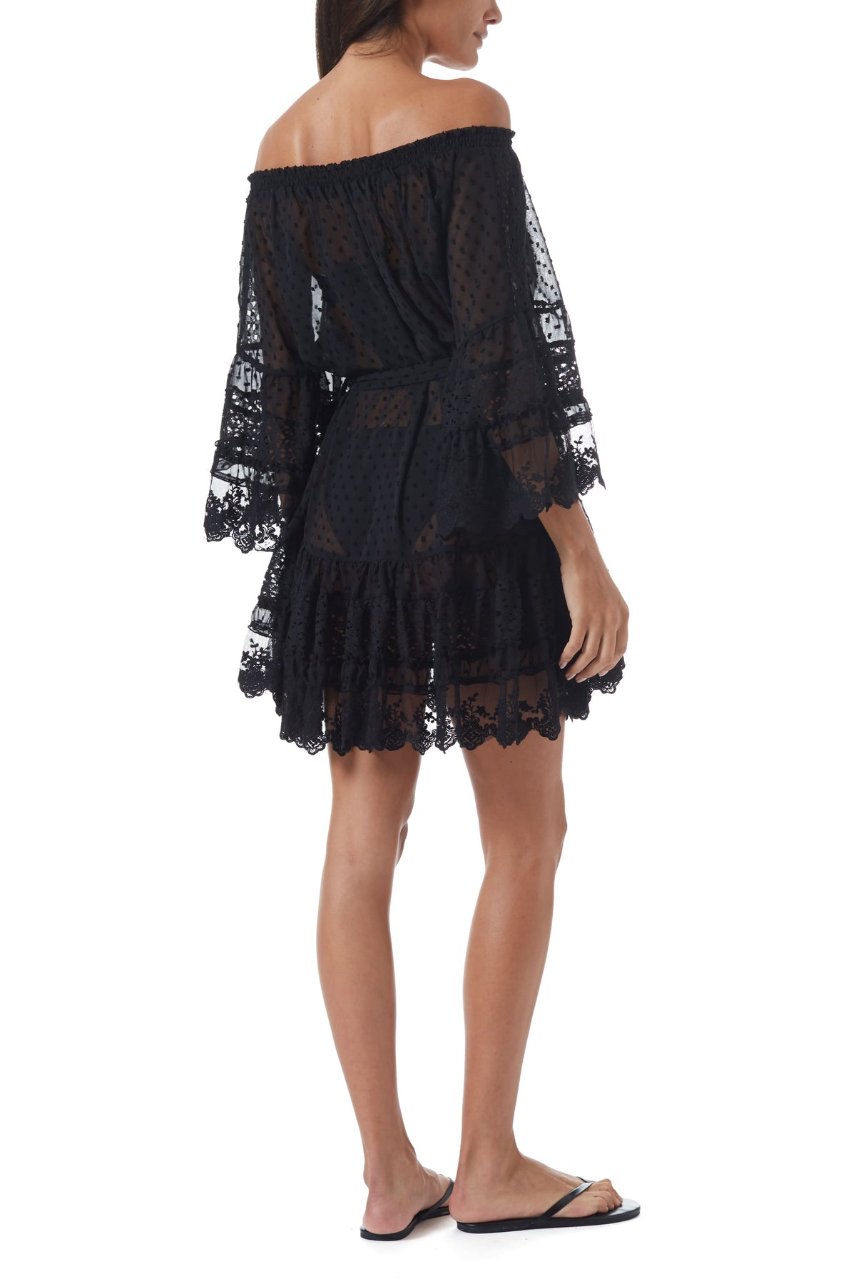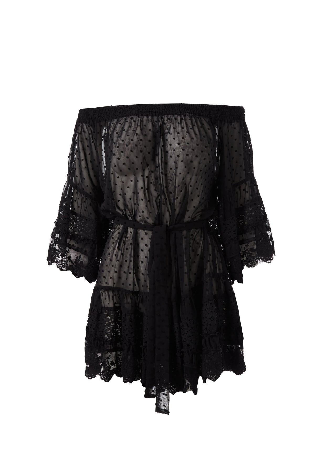 Egal zu welchem Anlass, nehmen Sie das Kleid „Alice” in dieser Saison in Ihr Repertoire auf. Das Kleid aus leicht durchsichtigem und mit kleinen Punkten besticktem Stoff hat eine schulterfreie Silhouette und ist am Ausschnitt gerafft, um mehr Volumen im Oberteil und an den Ärmeln zu schaffen. „Alice” ist an der Taille mit einem Stoffgürtel tailliert, der diesem ansonsten lockeren Schnitt Form verleiht. Der kurze Rock und die Ärmel sind mit hübschen, gewellten Spitzenbesätzen versehen. Ein tolles Kleid für den entspannten Tag oder auch ein Hingucker für die Sommer Party.