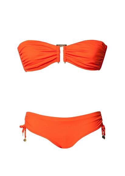 Der Every Day Bandeau Bikini in Orange von Onda de Mar wurde mit leichten herausnehmbaren Polstern, seitlichen Stäbchen für extra Halt und abnehmbaren Neckholder-Trägern versehen. Durch ein goldfarbenes Schmuckstück in der vorderen Mitte empfehlen wir dieses Bikini Oberteil für kleinere und mittlere Oberweiten.