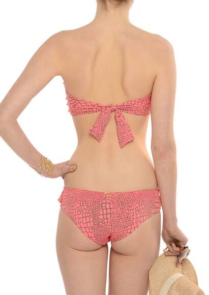Das Bandeau Rüschen Bikini Oberteil von Onda de Mar wurde aus einem bedruckten Stretch-Nylon in Boha Optik gefertigt. Die verspielten Rüschen geben diesem Bikini einen ganz besonderen Look. Das Oberteil ist seitlich mit Stäbchen verstärkt und wird für sicheren Halt mit einem optionalen Neckholder-Band geliefert.