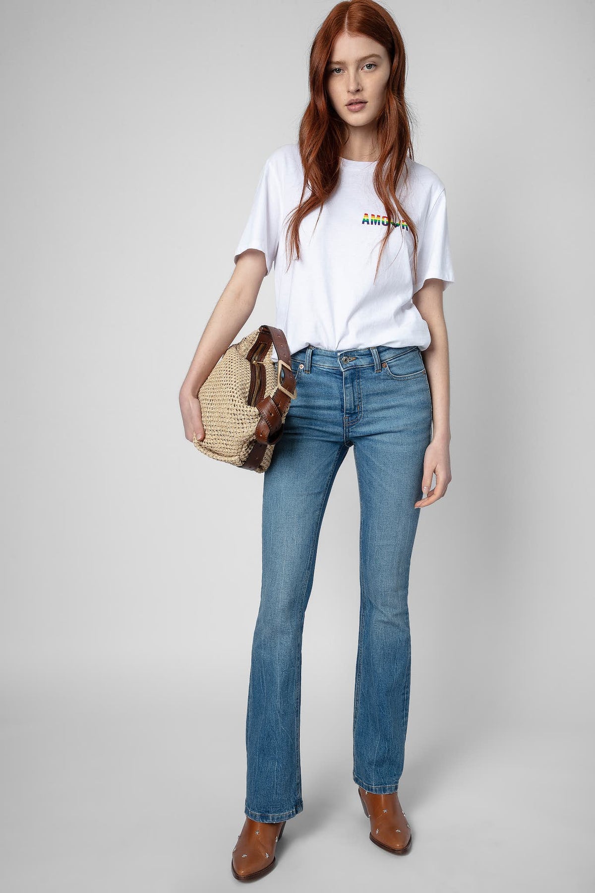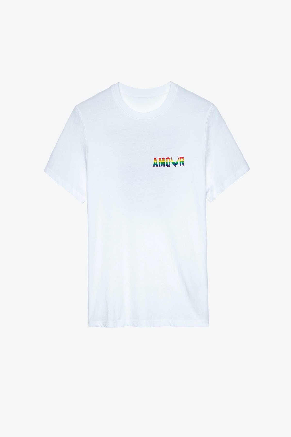 Weißes T-Shirt aus Baumwolle mit Rundhalsausschnitt und kurzen Ärmeln, das auf der Vorder- und Rückseite mit einem mehrfarbigen Amour-Aufdruck versehen ist.