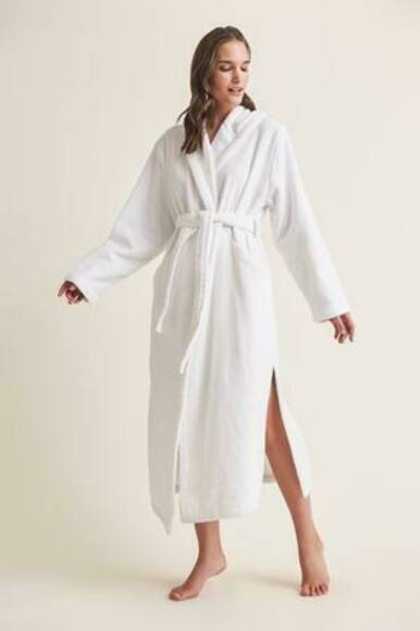 Cover yourself in the softness of the Hamam Spa Robe. This bathrobe will help you dry off after a relaxing bath or shower. The hood makes it an extra comfortable choice for early mornings or after a long day. The Hamam Spa Robe comes with a matching headband.