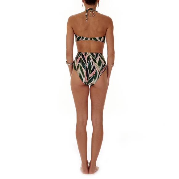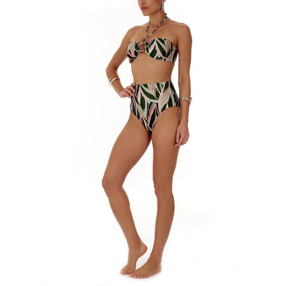 A great green/beige patterned bikini by Adriana Degreas with high-cut bikini bottoms and a bandeau bikini top that can be tied at the neck.