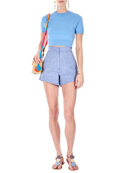 The Finzi crop top from the Ready To Wear Collection made of fine knit has short sleeves with ribbed details and a ribbed hem. The top has a fitted silhouette and a round neckline.