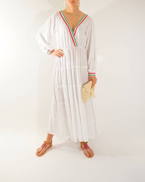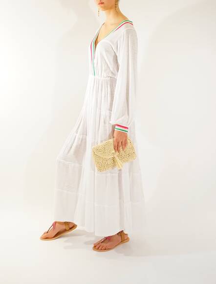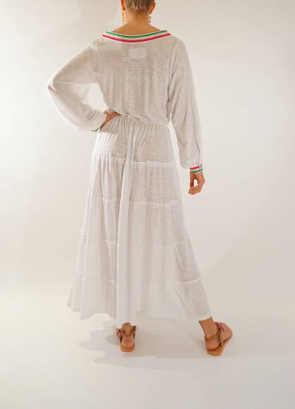 Long casual dress with colorful applications.